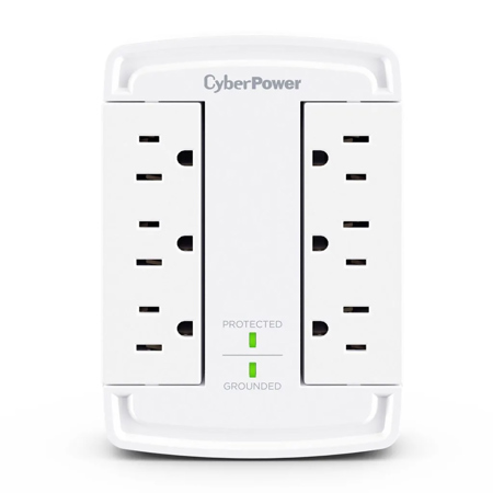 The CyberPower CSB6WS Surge Protector transforms a standard 2-outlet wall socket into six surge-protected outlets, giving you the space and safety your devices need. Perfect for crowded areas where chargers, computers, and electronics compete for limited plugs. Featuring dual swiveling outlet banks, this surge protector offers flexible positioning and improved cord management-keeping your setup neat and organized. With 1800 joules of surge protection, it defends your valuable tech from power spikes and electrical surges. Ideal for safeguarding computers, routers, modems, chargers, and other personal tech essentials.