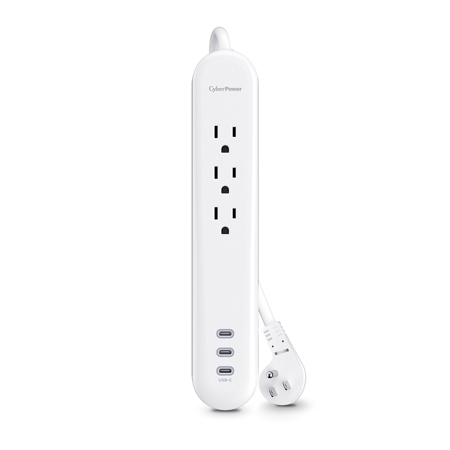Combining form and function, the CyberPower P304UC3 Surge Protector protects electronics from harmful energy spikes and surges, and the contemporary design helps it blend into a modern home. As a surge suppressor, it will prevent electrical spikes from reaching your electronics and mobile devices. With three standard outlets and three USB-C ports, the P304UC3 can directly charge three USB-C enabled devices, while providing AC power to three additional electronic devices.