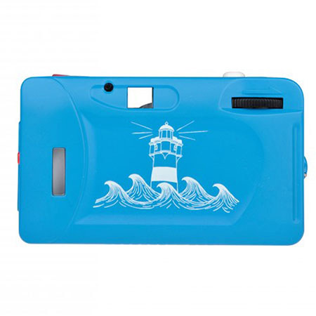 The Lomography Fisheye One 35mm Film Format Multicolor Camera (Nautic) white and blue-colored Fisheye One 35mm Camera from Lomography is a compact 35mm film camera that features a plastic 10mm fisheye lens with a fixed f/8 aperture for producing a distorted circular image on a rectangular frame. This camera has an extremely wide field of view of 170deg. which means that even when not using the built-in viewfinder you will easily be able to capture your subject on the 35mm film frame, allowing for more experimentation with your angles and shots. The camera also has a shutter speed of 1/100 second for use in most shooting conditions and it has a built-in electronic flash to help in low-light. This flash is powered by one AA battery.