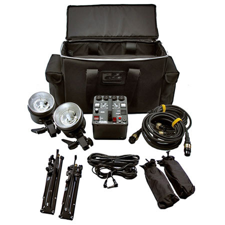 The included MH2050 flash heads have a 250W modeling light, user replaceable 2000W/s capacity flash tube and an ideal color temperature of 5400K. Fan-cooling means that you'll get extended life out of both the flash tube and modeling lamp. The detachable 18" power cable insures that the heads have the smallest possible profile for packing and transporting. The kit's light stands and umbrellas both employ a unique design that lets them fold in upon themselves to fit in the soft-sided Cordura case.