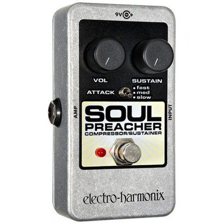 The Soul Preacher Compressor/Sustainer Pedal also features a 1/4" AMP jack for audio output and a 1/4" Input jack for audio input. The pedal's Attack function sets the timing of the attack/decay, allowing you to customize your sound to your exact preferences.