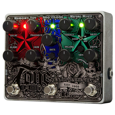 The EHX Tone Tattoo is our premier fully-interactive, analog multi-effects pedal, designed to satisfy your tone cravings. It delivers robust Lead & Rhythm tones, with full tone sculpting capabilities, including two levels of scoop for a tailored sound.