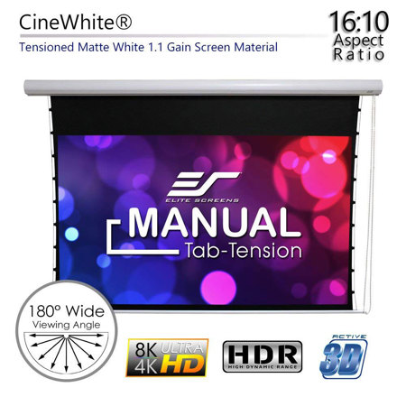 113-inch Diagonal, 16:10 Aspect Ratio. View Size: 59.9" H x 95.8" W. Overall Size: 73.1" H x 114.4" W x 4.6" D. White Case.