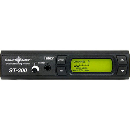 The ST-300 Base Transmitter features 17 user selectable frequencies digitally controlled from the front panel control buttons, a headphone jack with adjustable level for input signal monitoring and a backlit LCD display that shows Channel, Frequency and Audio Input Level. On the back of the unit is a balanced XLR-3F as well as an unbalanced 1/4" input. Front panel controls and LCD display allow the user to select mic, line and 70 volt input options, attenuate the input levels and change hi/low RF transmit power. A new feature called Enhanced Dynamic Range (E.D.R.) works with the SR-400 receiver to provide clearer, more dynamic audio.
