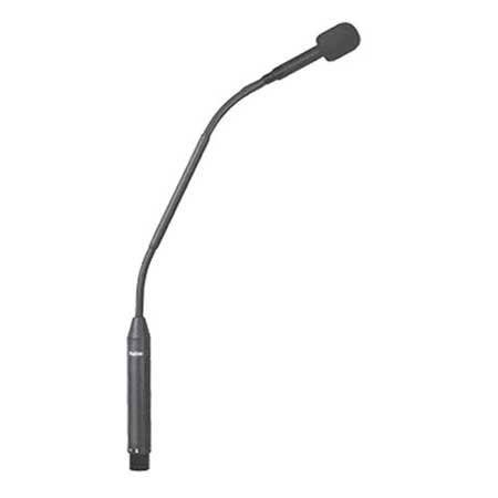 The microphone shall accept sound pressure levels up to 145 dB producing no more than 3% THD. Gooseneck will have a rigid center section with flexible gooseneck at both ends. Overall length above the XLR connector shall be 18.2" (46.22cm) long for FMR500. The maximum head diameter shall be 1.0"(2.54cm). The microphone shall be terminated with a professional gold-plated 3 pin XLR connector. The microphone shall include an external windscreen. The microphone shall require 48V phantom power. The microphone shall be made of metal with black finish. The microphone shall have its entire flexible portion encased in black vinyl.