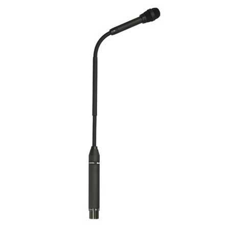 The microphone shall accept sound pressure levels up to 145 dB producing no more than 3% THD. Gooseneck will have a rigid center section with flexible gooseneck at both ends. Overall length above the XLR connector shall be 18.2" (46.22cm) long for FMR500. The maximum head diameter shall be 1.0"(2.54cm). The microphone shall be terminated with a professional gold-plated 3 pin XLR connector. The microphone shall include an external windscreen. The microphone shall require 48V phantom power. The microphone shall be made of metal with black finish. The microphone shall have its entire flexible portion encased in black vinyl.