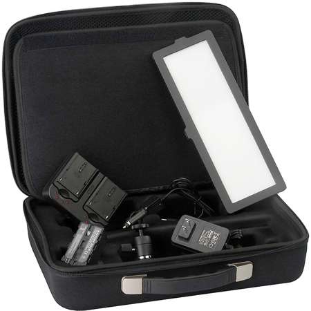 Every Flapjack light runs on either AC power or a NP-F style rechargeable battery, both of which are included in the kit. The light is fully dimmable, with no change in color temperature, from 10-100%. The light is also dual colored allowing you to adjust the color temperature from a amber tungsten 3200k to white daylight 5600k. A back-lit LCD indicator shows light level, color temperature and battery life status.