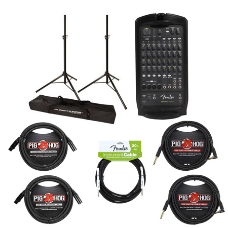 Fender Passport VENUE 120V US Self Contained Portable PA System, Black - Bundle With Tripod-Style Speaker Stand Pair, 2x 15' 8mm XLR Mic Cable, 2x 10' Instrument Cable, Fender 20' Instrument Cable Black