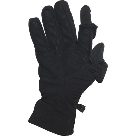 A great photographer's glove that is soft shell with a zipper pocket on the back of the left hand to hold a memory card. The gloves are fleece lined and have flip back index finger and thumb caps which are held down and out of the way with small magnets.
