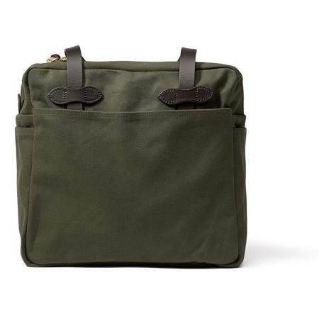 Filson's water-repellent, abrasion-resistant closable tote features a roomy interior for versatility, fFilson's pockets and rustproof brass zipper closure. It meets standard airline carry-on size requirements for use when traveling, and is built to handle heavy loads as well as tight spaces.