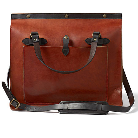 The Filson Large Leather Cognac Tote Bag is made with vegetable-tanned leather from the USA and has a water-repellent Tin Cloth storm flap, Bridle Leather handles and four pockets.