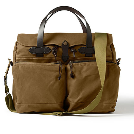 The Filson 24 Hour Tin Tan Briefcase is designed for all weather conditions, this water-repellent Tin Cloth briefcase is fully lined and features an interior laptop divider, removable shoulder strap, multiple pockets and trolley strap to loop over luggage handles.