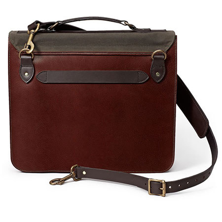 The Filson Leather Dark Brown Briefcase made of vegetable-tanned leather from the USA and built to endure. It features a water-repellent Tin Cloth storm flap, trolley strap for luggage and adjustable carrying options.