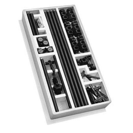 The kit includes frames and boom arms, complemented by flexible offshoot arms, allowing for a variety of configurations using the various connectors and clamps.