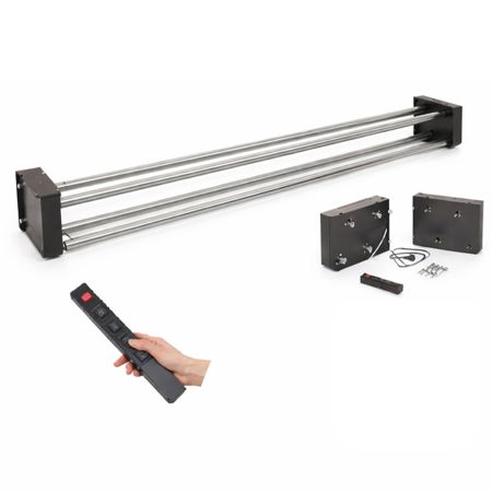 Each motorized crossbar can support up to 15 lb, allowing a total system load of 60 lb, making it ideal for standard 9-foot seamless paper rolls or fabric backdrops. The included wireless remote with 16 channels minimizes interference from other electronics and allows control from up to 164 feet away. A tethered manual remote switch is also included for direct control in permanent studio setups.