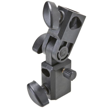 The F&V Lighting Universal Holder A attaches to stands that have a 5/8" stud. It enables the adjusting of pan and tilt for a light and most importantly it has a receiver for holding an umbrella. The Holder has one 5/8" female receiver on the top and bottom. The bottom female receiver can be used either vertically or horizontally, whether being mounted vertically on a stud or horizontally on the arm of a c-stand.