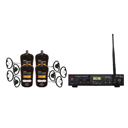 The kit includes an AS-TXRM Table Top transmitter, four AS-TVBPR receivers, two AS-DCBPTR chargers, and four sets of ear cups.