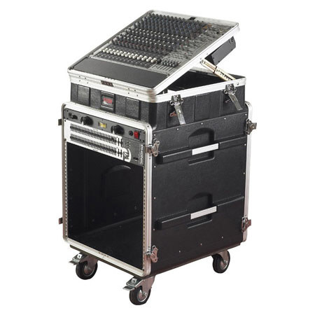 The Gator Cases GRC10x12PU 10U Top, 12U Side Console Audio Rack is contain front and rear threaded rails. The top rack is perfect for mixers and uses a pop-up ratchet system for transporting flat then elevating to various angles. The case is constructed from a high-density polyethylene material. It has molded sloped, side carrying handles and four 4.0" industrial casters; two of the casters lock to keep the case in place.