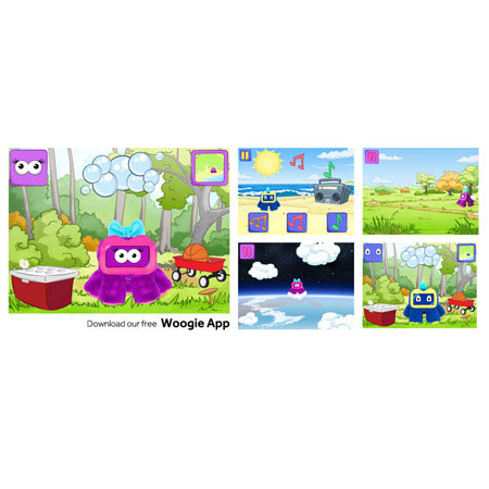• Take Woogie on adventures to places like Space, the Beach and the Grocery