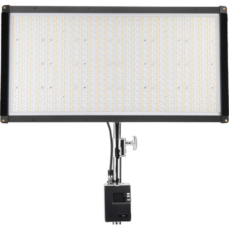A rugged metal housing and advanced heat-sink design keep the fixture cool and stable during continuous operation. Power the light using the included AC cable or add a V-mount battery to the controller's battery plate for on-the-go shooting. A USB-A port is provided for firmware updates.
