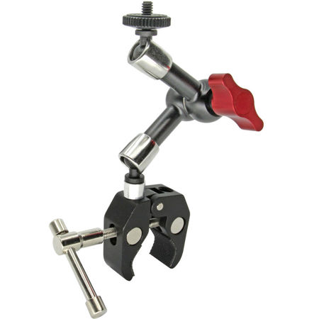 This heavy-duty 7" articulated arm helps you get the angle you need for a monitor mount with two full-swivel ball joints and one pivot joint. The arm mounts via clamp onto any round rod or pole within the size range, and a large wingnut makes it easy to secure the arm into position once it's clamped on. A standard tripod screw mount secures your monitor to its perch.