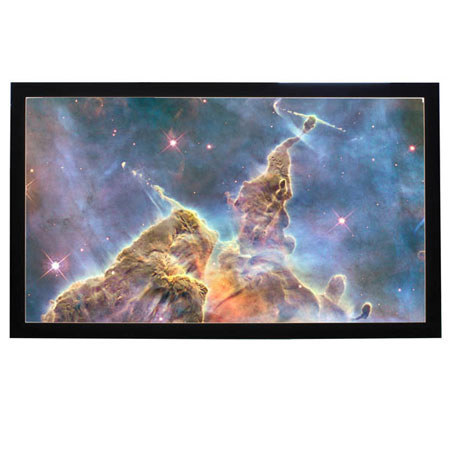 The Hamilton Buhl 120" Diagonal Fixed Frame Projector Screen is a simple and effective way to set up a wall mounted projection system in your home or office. The uncomplicated design of this system makes for rapid assembly and hanging. Tension is provided to the screen from the tabs on to which the matte white screen fabric attaches. The sturdy aluminum frame holds the fabric firmly in place assuring an even, bright and crisp image. The borders are all trimmed in black and serve to both absorb any stray ambient light as well as help focus your audience's attention on the image.