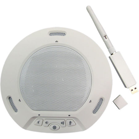 Get the clutter off your conference room table! The HuddlePod Air is a 2.4 GHz wireless audio conferencing speakerphone, designed to work with any UAC compatible software (e.g. Skype, Lync, Webex, GoToMeeting, Zoom.US, Jabber, Spontania, etc ). Whether Win 7, 8 or 8.1, connect the receiver antenna to a USB port and you are ready to go with Full Duplex audio for all of your conferencing needs. Ideal for 1-10 person tables. Built-in automatic DSP and EQ: 256 channel acoustic echo cancellation, up to 16dB noise cancellation and auto level control. 360 degree, omni-directional pickup. Ships with wireless receiver and antenna, neoprene travel case, protective cap for receiver USB plug and USB charging cable. Simultaneous 3.5mm audio output jack on speakerphone for headphones or additional amplification (of far-side) by an external system.