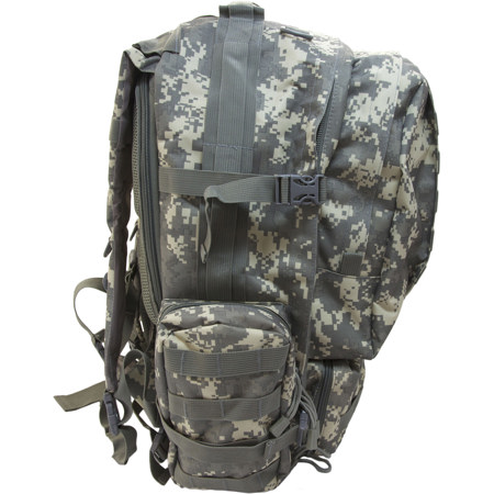 The CampCo Humvee Double Reinforced 3-Day Digital Camo Assault Pack features polyester/nylon fabric, double reinforced stitching, reinforced carry/drag handles and water repellent construction. External compression straps. This product is designed to survive the most demanding situations while still remaining simple and easy to use.
