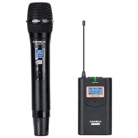 The CVM-WM100-HTX from Comica is a Wireless Handheld Transmitter Microphone for the Comica. The microphone includes a low cut filter mode When using the Comica wireless microphone/transmitter in a noisy environment, you can cut out the low-frequency noise by adjusting the toggle switch on the microphone. The low cut function can effectively reduce environmental noise or wind noise. The Comica Wireless Handheld Microphone Transmitter uses AA batteries as its power source to avoid the issue of having to recharge in the middle of a shoot. The working time is up to 3-5 hours. The CVM-WM100-HTX provides you with a variety of flexible wireless microphone system options. It can be synced to the CVM-WM100 receivers.