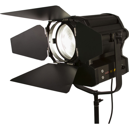 The iKan White Star 6" Fresnel 200W LED Light is designed and built for professional photographers, videographers and cinematographers who want high quality at an affordable price. The 5600K Daylight Fresnel light delivers field-tested reliability, solid construction and all the features required for professional performance. The lights features include a 6" Fresnel lens with a spot to flood focusing knob and a quiet active cooling system that delivers reliable, consistent performance. The White Star 6" Fresnel 200 Watt Light is made from a solid aluminum construction and has an energy efficient LED that has a high output with an excellent color rendering index. The White Star has local built in dimming as well as a digital readout for assigning the light to a DMX channel. The ultra quiet active cooling fan pulls heat from the fixture. The 4 leaf barn doors cut and shape the light and can be folded flat for transportation.