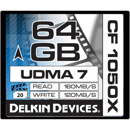 The Delkin 64GB CF1050x Cinema Compact Flash Memory Card (Made in USA) is a specialized cinema card that's designed to excel in high end recording equipment, such as 4K cameras and digital backs. With capabilities to record data at speeds surpassing 120MB/s, built in UDMA 7 support and VPG (Video Performance Guarantee) profiling, the CF 1050x card keeps up with the most demanding digital cinematography requirements.
