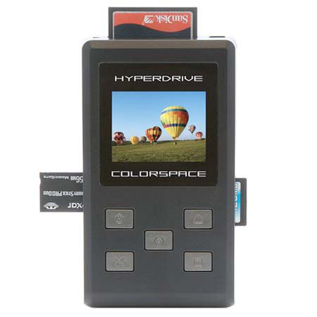 HyperDrive COLORSPACE is a color LCD equipped hard drive that allows you to backup, store, view photos/data from memory cards on the go without the need for computers or external power. COLORSPACE comes with Built-in Battery, AC adapter, Car Charger, Carrying Case & USB cable.