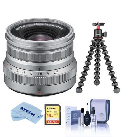 The bundle includes the Fujifilm XF 16mm f/2.8 R WR Lens, the Joby GorillaPod 3K Kit, a 32GB U3 SDHC Card, a Cleaning Kit, and a Microfiber Cloth.