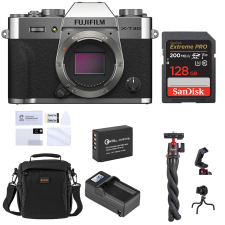 Before diving into the world of photography and videography, consider the X-T30 II Mirrorless Camera, Silver, bundled with a Shotgun Microphone, Tripod with Fluid Head, Battery, and 128GB UHS-I Memory Card. This state-of-the-art camera is a blend of advanced technology and vintage aesthetics, designed to cater to both still photographers and videographers at all skill levels.