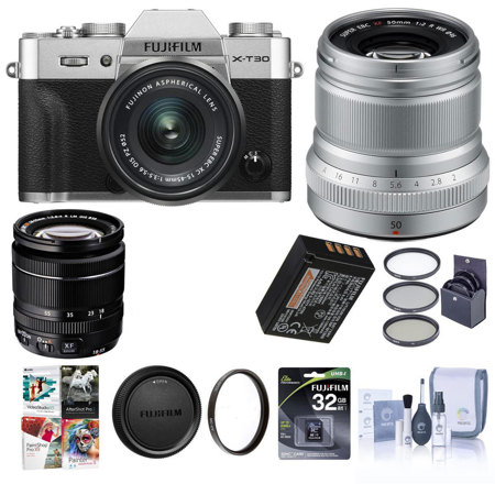 Fujifilm X-T30 Mirrorless Camera Silver With XC 15-45mm f/3.5-5.6 OIS PZ Lens & XF 50mm (76mm) F/2R WR Lens, Silver - Bundle With 32GB SDHC Card, 52mm Filter Kit, 43mm UV Filter, Cleaning Kit, Software Pack