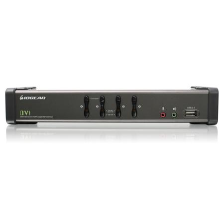 The 4-Port DVI KVMP Switch with Cable from Iogear allows a single user to manage 4 separate workstations with one keyboard, mouse and monitor. Switch between the computers via the switch on the front panel or by hotkey. Asynchronous switching allows you to use peripherals from one computer while the switch targets another one, allowing you to switch without interrupting printing or another peripheral device in use.