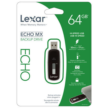 Designed for netbook and notebook users, the Lexar Echo MX is a high-capacity, high-performance, flash-based backup drive that easily plugs into your system's USB port to provide automatic backup of your files. Built-in Lexar Echo backup software activates as soon as it's plugged in, to securely and automatically protect files with 128-bit AES encryption. The drive also performs ongoing backups to any files in use and restores previously saved versions of a file - providing peace of mind that your data is safe. What's more, the software works across platforms with one seamless interface, allowing you to easily back up or restore files on either a PC or a Mac system.