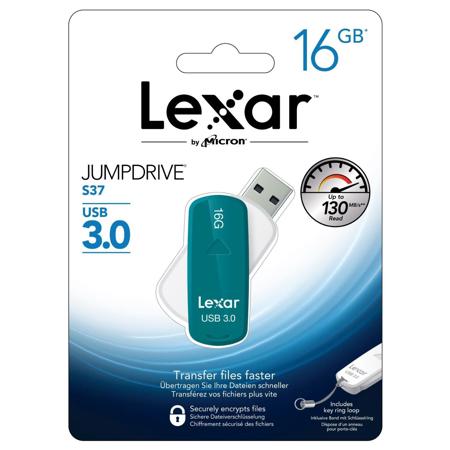 The affordable, high-performance Lexar JumpDrive S37 allows you to quickly and securely transfer photos, videos and files with speeds up to 150MB/s read and 60MB/s write. Quickly transfer a 3GB HD video clip in less than 1 minute, compared to the 4 minutes it takes using a standard USB 2.0 drive. The drive is loaded with advanced security software for data protection and features a stylish swivel design with a retractable connector, which means there's no cap to lose. It's available in an assortment of colorful capacity options (16GB-128GB) and includes three-year limited warranty.