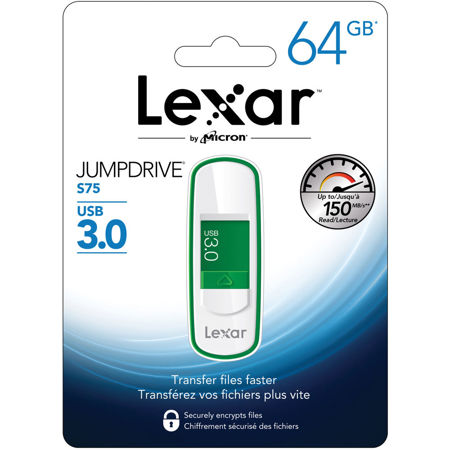 Quickly and securely transfer photos, videos and files with the affordable, high-performance Lexar JumpDrive S75 USB 3.0 drive. It features a retractable connector with an easy-to-use thumb slide, comes in a range of colors and is available in capacities from 16GB-256GB.