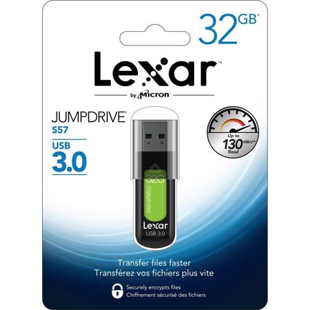 The high-performance Lexar JumpDrive S57 USB 3.0 flash drive allows you to quickly and securely transfer photos, videos and files with a transfer speed up to 150MB/s. The drive is available in a range of capacities and colors and includes a three-year limited warranty. Backwards compatible with USB 2.0 devices.