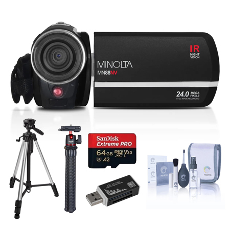 Minolta s MN88NV 1080P night vision camcorder captures videos and pictures, day or night. With 24.0 MP max resolution, 1080P Full HD video resolution, 16x digital zoom and anti-shake image stabilization provide superb images. An infrared LED, with up to 35 feet of coverage, and a 3.0" 262k wide-screen Touch LCD are ideal for night scenes and low-light conditions. With a 32GB capacity SDHC storage slot, you can record hours of video and thousands of pictures. Includes high-capacity li-ion battery, charger, case, image editing software, and HDMI + USB cables.