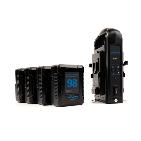 What you have here is a robust and high-quality 4x Micro-Series 98Wh V-Mount Li-Ion Battery and Dual Charger Kit, designed to power your professional cameras and other electronic devices efficiently. This comprehensive kit includes four powerful Micro-Series V-Mount Li-Ion batteries and a 16.8V DC dual charger, specifically designed for V-Mount batteries.