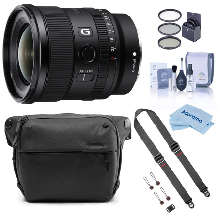 The bundle with the Sony FE 20mm f/1.8 G Lens includes a Peak Design Everyday Sling V2, SlideLITE Strap, 67mm filter kit, cleaning kit, and cleaning cloth.