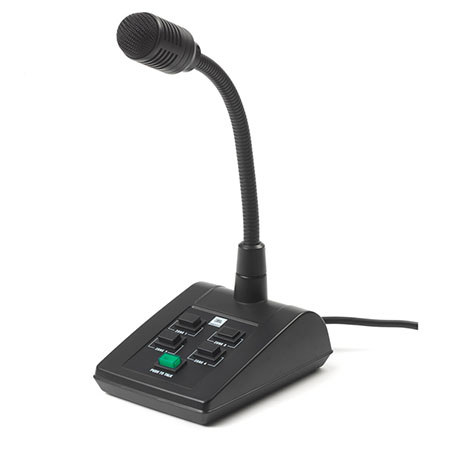 The JBL CSPM-4 CSM 4-Zone Paging Station Dynamic Microphone features close-talking for paging systems in bars/pubs, theatre lobbies, department store and more. A single cable attached to the CSPM-4 contains three conductors for audio (Positive, Negative, Shield) and five conductors for contact closure (Zone 1, Zone 2, Zone 3, Zone 4, Ground). Selecting a zone and pressing and holding the PTT button will route the microphone audio to that zone.