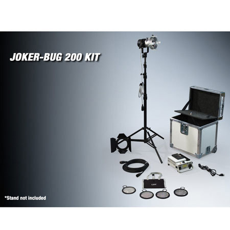 The K 5600 Single 200W Kit is a single light, 200 watt system that contains Joker-Bug 200 Watt lamp head. The output of the Joker-Bug 200 can be compared to a 750/1000 Watt quartz fixture, but with a power draw of only 3 Amps. It has become a standard for small interiors, interviews, documentaries, and car shots. The system will travel and operate in 110 and 220 Volt environments as well as on 24/30 Volt belts or packs with a Slimverter 200 or 400 (a dedicated 200 Watt Slimverter is available to accommodate two Anton Bauer ProPac).