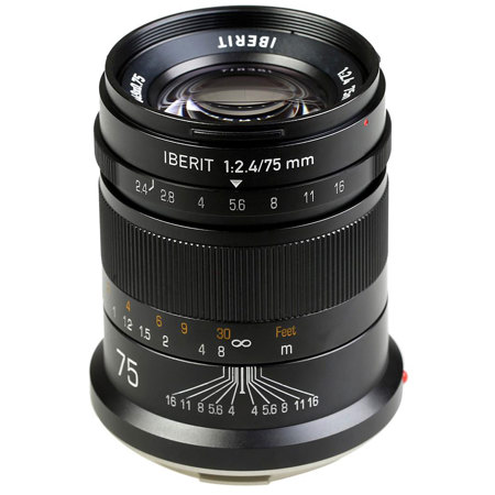 The black IBERIT 75mm f/2.4 for Leica SL mount camera from HandeVision is a Portrait-length prime lens. . With a simple five elements in five groups optical design to provide a classic image quality that is also well-suited to use on current image sensors. With the manual focus design will allow you to work with subjects as close as 2' away. The all-metal construction of the lens housing utilizes anodized aluminum, brass, and stainless steel for rigidity and strength, and the barrel also features depth of field and focusing distance scales for more accurate focusing control.