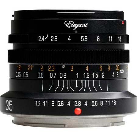The Elegant 35mm f/2.4 from Kipon is a general wide-angle prime designed for Canon RF-mount mirrorless cameras. It utilizes a simple six elements in six groups optical design to produce a classic image quality, which is benefitted by a smooth manual focusing action for working with subjects as close as 1.1' away. An all-metal construction realizes a rugged physical design, and the lens barrel's exterior also incorporates both depth of field and focusing distance scales for more accurate focus control.