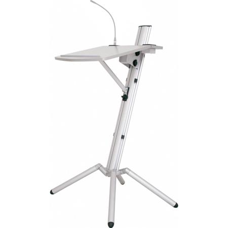 Sturdy, sloping extruded aluminum column, with raised legs (for plenty of leg room). Elegant manuscript rest with an embossed aluminum surface and stop rail. Height and angle are infinitely adjustable. Elegant cable management with feed-through bushing and cable clips. Two 3-pin XLR microphone sockets, acoustically insulated for recording with gooseneck or other lightweight microphones with XLR plugs (not included).