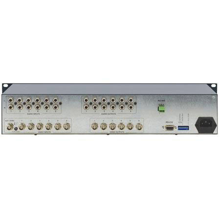 6 composite video, 1Vpp/75 Ohm on BNC connectors; 1 sync/video genlock 1Vpp/75 Ohm with sync select switch; 6 audio stereo, +4dBu/33k Ohm on RCA connectors