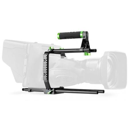 The Lanparte BMSC Basic Cage has 1/4"-20 and 3/8"-16 threaded holes on the bottom for attaching it to a tripod or bridgeplate and can be used with the included top handle for easy carrying. This compact cage comes with 15mm rods that can be used to mount the Blackmagic Studio Camera.